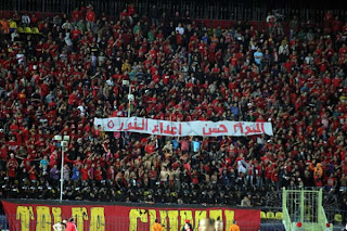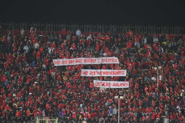 وهتفت جماهير الأهلي بأغنية خاصة أعدوها لثورة 25 يناير والتي تهاجم النظام السابق ، كما رفعوا لافتة كتب عليها "التوأم حسن أعداء الثورة"!! ومع نهاية الشوط الأول وجهت الجماهير السباب لحبيب العادلي وزير الداخلية السابق.